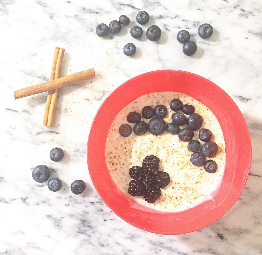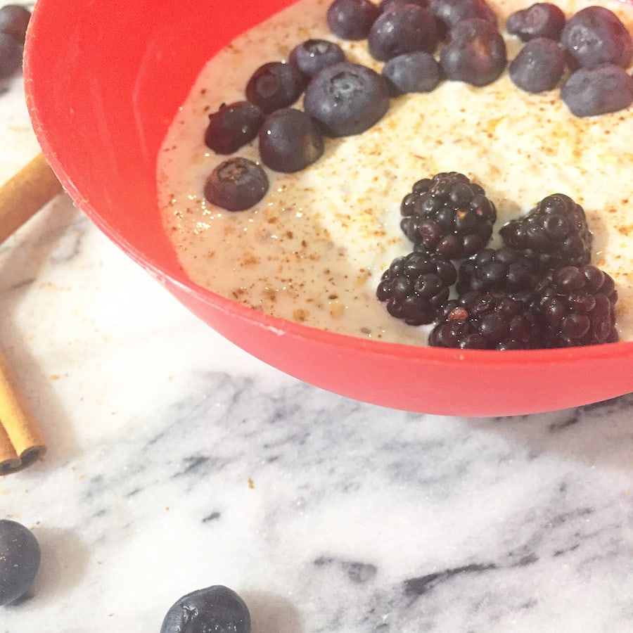 I combined 1/2 cup of non-fat strawberry Greek-style yogurt, 1/2 cup unsweetened steel cut oats, and 1/2 cup 2% reduced fat organic milk. Since we already had strawberries in the yogurt, I added some fresh blackberries and blueberries right on top. I topped it off with some fresh cinnamon. I let the mix sit in the fridge overnight and…boom…it was amazing!!! So simple, but so good. The mix of textures, flavors, and nutrition really makes me love this combo. It’s a perfect, quick breakfast for the entire family you love!!